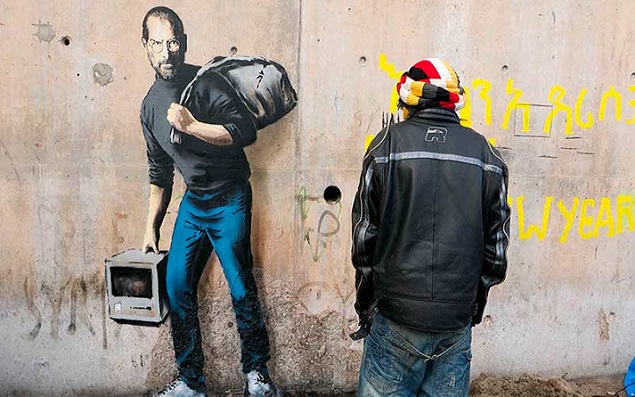 بنکسی انگلیسی، هنرمند مطرح و جنجالی گرافیتی، در آخرین اثر خود تصویری از استیو جابز بنیانکذار شرکت اپل را در اعتراض به سیاستهای فرانسه و اروپا در برخورد با پناهجویان خاورمیانه، بر روی دیوار کمپ «جنگل» در کالایس فرانسه نقاشی کرده است. تعداد زیادی از پناهجویان در این کمپ با وضعیت بدی به سر میبرند.