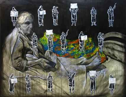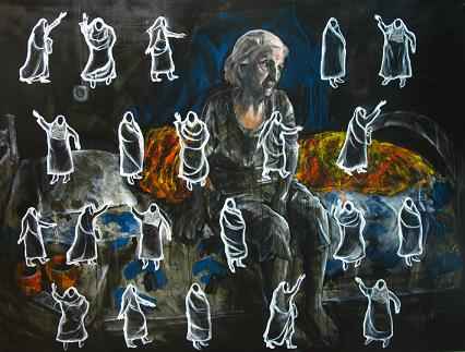 اگر آثار مجموعه «پردههای واژگون» را به صورت روایت این مفاهیم پیش رویم متوجه میشویم کمکم هسته این گفتمان را باوجود تناقضها و دوگانگیها پذیرفته است یا لااقل انعطاف یافته است. بحث خود را با تفسیر دو شکل 4 و 5 که به دنبال یکدیگر مفهوم نهایی را ساختهاند به پایان میرسانم. در شکل 4 پیرزنی را در چند سال اخیر مشاهده میکنیم که زاویه دیدش به گذشتهها است اما این گذشته بعید نیست. نگاه او به سالهای اخیر است که زنان ایرانی برای آرمانهای خود برای اولین بار در تاریخ کشور دوشادوش مردان وارد صحنههای اجتماعی شدند و سهم زیادی در انقلاب ایران داشتهاند. انقلابی که همانطور که توضیح داده شد در هسته سمیوسفر قبلی حضور داشته که نقش حاشیه فرهنگی دیگری را بازی کرده است. در شکل 5 پیرزن سالخوردهتر شده ابزار تکنولوژی –کنترل- را در دست گرفته است و شرایط فرهنگی و جایگاه اجتماعی زن را دگرگون میبیند. کنترل خود چندین دلالت دارد. در دلالت صریح نشانه ابزار امروزی، در دلالت ضمنی متناقض پیرزنی است که دیگر ابزار را در کنارش ندارد و در دست گرفته است و در سومین لایه دلالت نقشی اسطورهای و بینارسانهای دارد. پیرزن نگاهی به نزدیک دارد و شاید به رسانهای دیگر که از آن شاهد حضور زنان جوانتر است. زنان نسل سومی که به صورت متکثر در حاشیه متن حضوری پر رنگ دارند. آنها هر کدام دارای پوشش متفاوت، نقشی خاص و هر یک خواهان جایگاهی اجتماعی برای خود هستند.